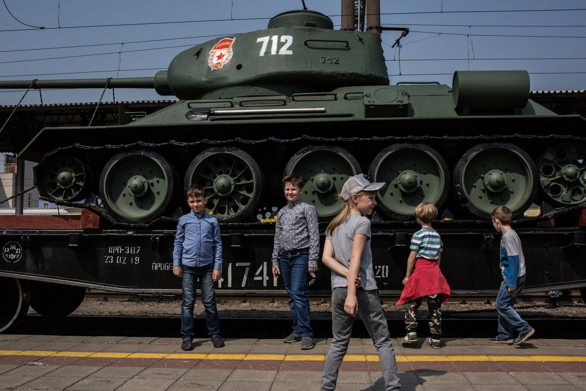 Дети играют возле танка на вокзале, Воронеж.
